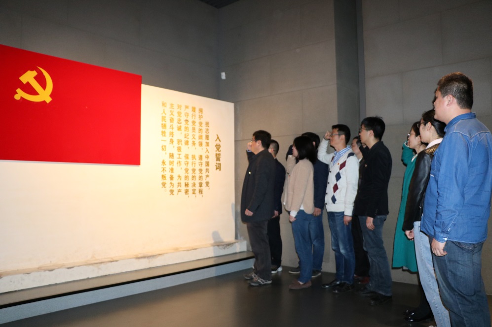 来到纪念馆党员宣誓墙,面对党旗,侯北平书记带领大家一起重温入党誓词。誓言铮铮,表达了对党的忠诚热爱和为共产主义事业奋斗终身的决心,坚定了不忘初心再出发,牢记使命勇担当的信心和决心。
