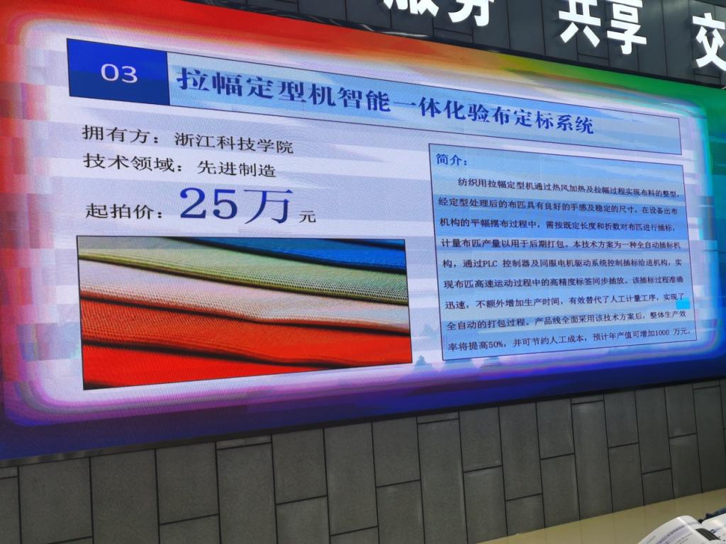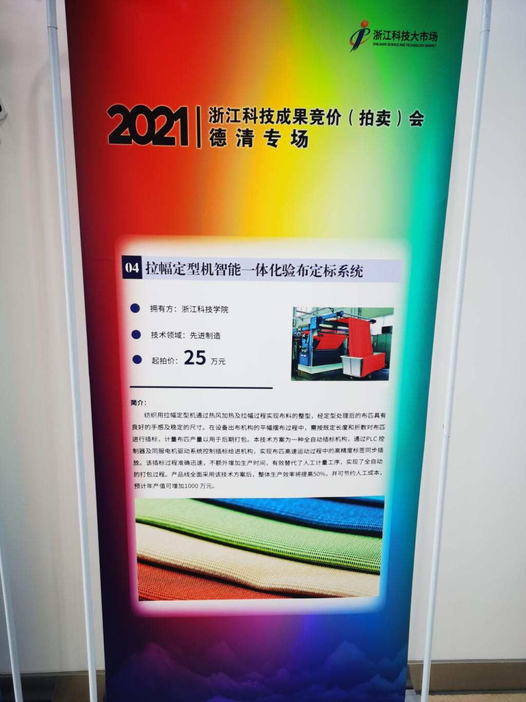 2021浙江科技成果竞价拍卖会于2021年4月30日在德清科技大市场举行。本次拍卖会共汇集了先进制造、生命科学、人工智能、互联网大数据等领域的8项科技成果。电气学院王子辉老师的科技成果“拉幅定型机智能一体化验布定标系统” 参与本次竞拍,最终该技术方案及其成果专利“一种自动插标装置(ZL201810724278.1)”以80万元的价格成交。