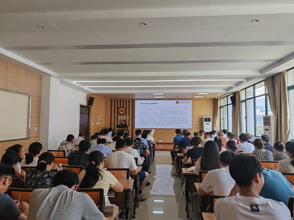 学院党委书记王杨向教职工传达了党的二十届三中全会精神,她强调,学习宣传贯彻党的二十届三中全会精神,是当前和今后一个时期的首要政治任务。广大教职工要切实增强学习宣传贯彻全会精神的政治自觉、思想自觉、行动自觉,要深学细悟习近平总书记重要讲话精神,深刻领会全会通过的《中共中央关于进一步全面深化改革、推进中国式现代化的决定》精神,把思想和行动统一到党中央决策部署上来,凝心聚力推动学校事业高质量发展。王杨结合第40个教师节的主题“大力弘扬教育家精神,加快建设教育强国”,领学了习近平总书记题为《培养德智体美劳全面发展的社会主义建设者和接班人》的文章,对师德师风建设做了进一步要求。并向全体教职工送上教师节祝福,感谢学院教职工在学院教育事业的发展上作出的辛勤付出。