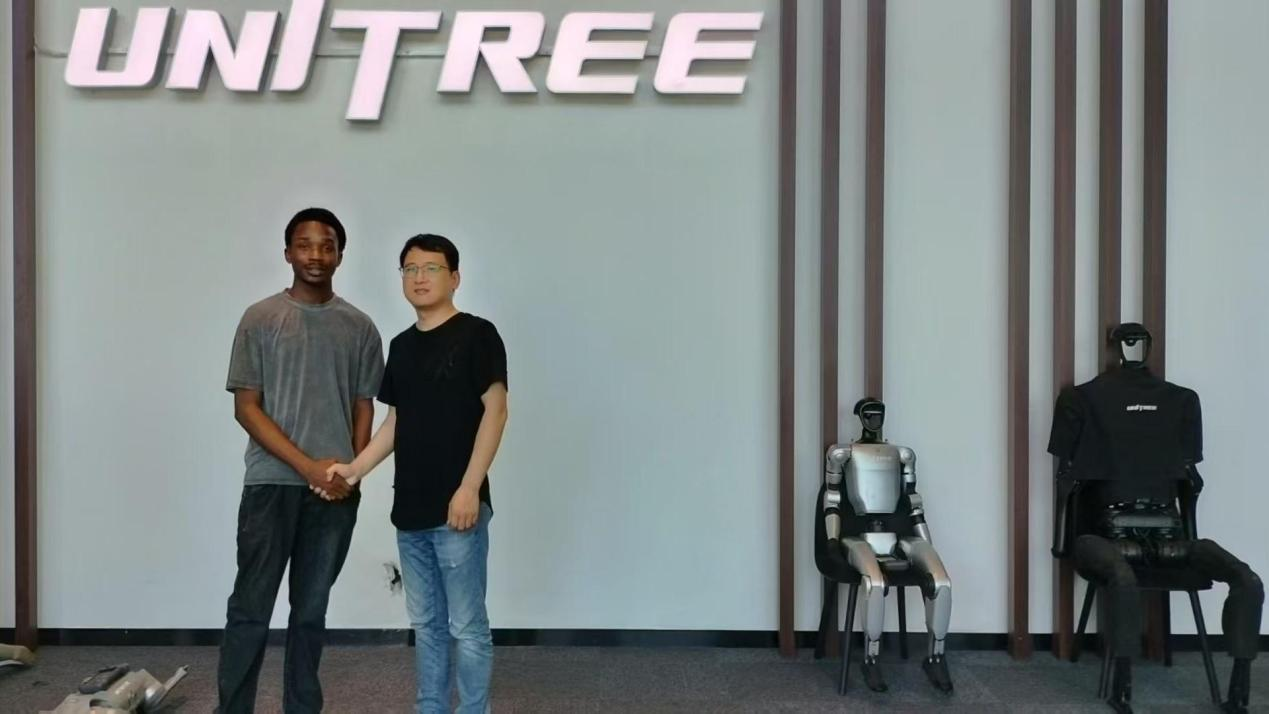 在技术交流环节,宇树科技专家围绕机器人运动控制、传感器应用等方向展开分享,师生们就AI技术在教育场景的落地、产学研合作模式等话题与专家深入探讨。来自尼日利亚的留学生Praise在全程参与后,激动地分享了自己的感受:“踏入宇树科技的展厅,那些灵活移动的四足机器狗和形态各异的机器人瞬间抓住了我的目光。在尼日利亚,我很少有机会能如此近距离接触到这样尖端的具身智能技术,它们流畅的动作和多样化的应用场景,让我真切感受到了中国科技的魅力与潜力。”聪普科技的张存树经理热情的和Praise交流,说“我们非常乐意与国际学子分享技术经验,希望Praise能将先进的技术理念带回尼日利亚,赋能当地发展。科技无国界,创新成果应当惠及更多国家和地区。”