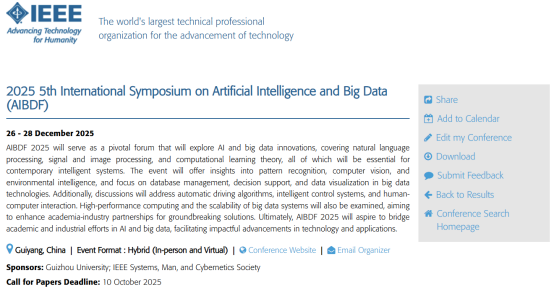 2025年第五届人工智能与大数据国际学术研讨会 (AIBDF 2025)将于2025年12月26-28日在中国贵阳举行。会议主要围绕人工智能与大数据等研究领域展开讨论。会议旨在为从事人工智能与大数据研究的专家学者、工程技术人员、技术研发人员提供一个共享科研成果和前沿技术,了解学术发展趋势,拓宽研究思路,加强学术研究和探讨,促进学术成果产业化合作的平台。大会诚邀国内外高校、科研机构专家、学者,企业界人士及其他相关人员参会交流!现向各学者征集稿件,并将以会议论文集的形式提交至IEEE出版社,并提交至IEEE Xplore收录, EI, Scopus检索。