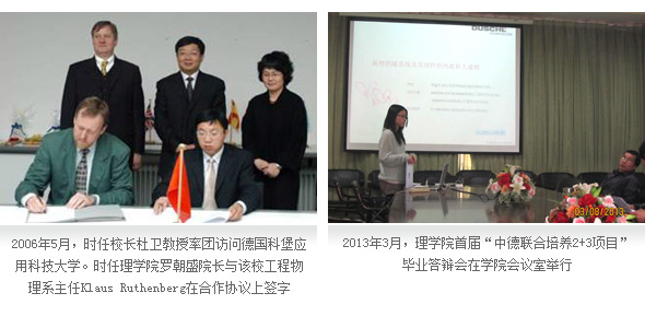 2006年5月26日,德国科堡应用科学大学与我院签订“2+3”项目合作协议,双方约定自2006-2007学年秋季学期开始设立新的国际化专业“应用物理”。该学士学位课程为10各学期,前4个学期在浙江科技学院完成。通过能力测试选拔出来的学生进入科堡应用科学大学完成剩下6个学期的学习,即“2+3”模式。根据该协议,科堡应用科学大学每年可接受8名应用物理专业的学生赴德国留学深造。顺利完成学业后,学生可获得浙江科技学院颁发的“理学学士”学位和德国科堡应用科学大学的“工学学士”学位。学生在德国学习期间免交学费。