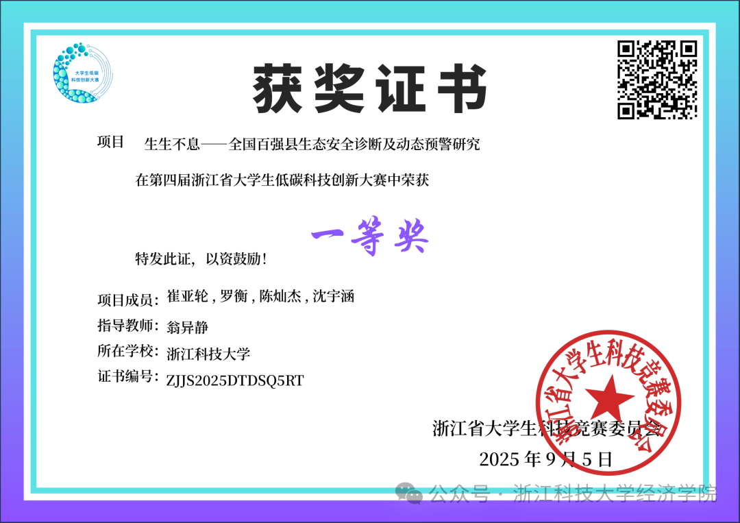 近日,第四届浙江省大学生低碳科技创新大赛评选结果正式揭晓。我院崔亚轮、罗衡、陈灿杰三位研究生组成的参赛团队凭借项目《生生不息——全国百强县生态安全诊断及动态预警研究》脱颖而出,荣获大赛研究生组一等奖,指导老师翁异静教授。