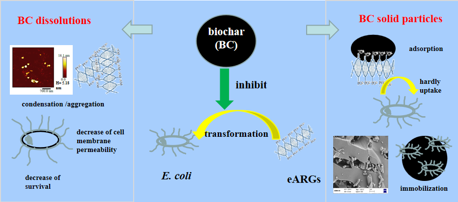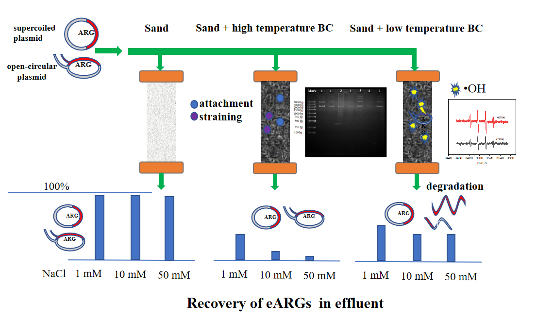 研究发现生物质炭能显著抑制胞外抗生素抗性基因的水平基因转移能力。低温(300 °C)生物质炭体系诱导质粒缩合反应,降低感受态细菌的细胞膜通透性,从而阻止感受态细菌对质粒的吸收和转化。高温(700 °C)生物质炭颗粒对质粒具有很强的不可逆吸附作用,被生物质炭吸附的质粒几乎不能被感受态细菌所利用而发生水平基因转移。同时,研究进一步发现生物质炭能有效降低胞外抗生素抗性基因在多孔介质中的迁移能力。在迁移过程中,高温(700 °C)生物质炭主要通过增加吸附容量、粘附作用(attachment)和筛滤作用(straining)等机制抑制了胞外抗生素抗性基因的迁移能力。低温(300 °C)生物质炭主要通过诱导羟基自由基的产生,使得开环质粒受到了碎片化损伤而失去活性,从而抑制了胞外抗生素抗性基因的迁移。上述研究成果将为缓解水土介质中抗生素抗性基因的传播扩散提供新的解决思路。(环资学院 方婧)
