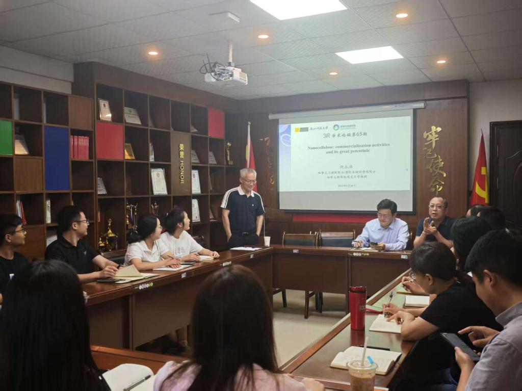 来访期间,倪永浩院士为师生作了题为“Nanocellulose: Commercialization Activities and Its Great Potentials”的学术报告,详细介绍了纳米纤维素的前沿研究进展、产业化应用及未来潜力。报告结合全球生物质材料发展趋势,特别分析了浙江省造纸产业转型发展的现状与机遇,为师生们提供了宝贵的学术与产业见解。
