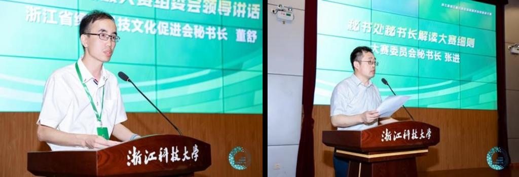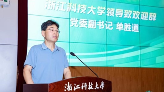 单胜道代表大赛承办方浙江科技大学致欢迎辞,首先对入围决赛的参赛师生表示祝贺和欢迎;同时指出同学们积极参与大学生低碳循环科技创新大赛,正是体现了同学们积极投身科技创新、绿色发展的青春朝气和锐气;最后希望各个参赛项目通过大赛平台相互交流、增进合作、推动创新。