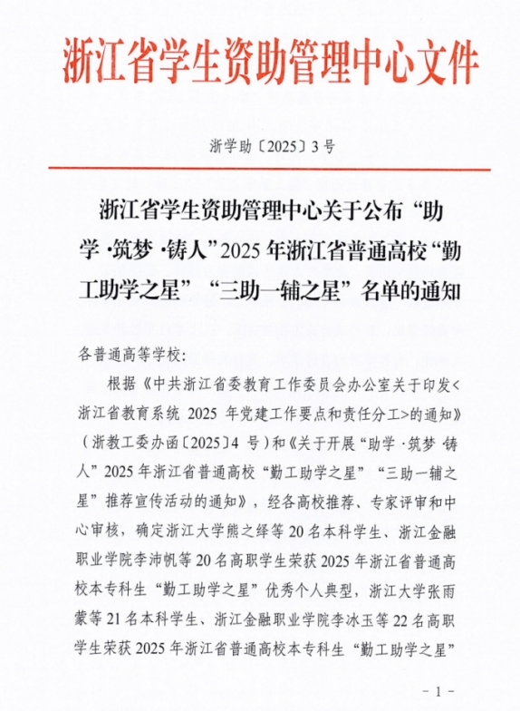 近期,浙江省学生资助管理中心发布《关于公布“助学·筑梦·铸人”2025年浙江省普通高校“勤工助学之星”“三助一辅之星”名单的通知》,我校自动化与电气工程学院尤壹杰、智能制造与能源工程学院龙凤两位同学入选2025年本专科生“勤工助学之星”优秀个人典型。