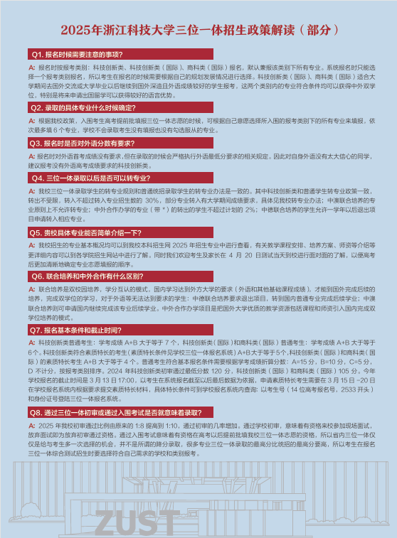 三、2025年3月31日,学校在本科招生网上公布初审合格名单,考生也可通过学校“三位一体”报名系统查询(http://zsb.zust.edu.cn)初审结果。