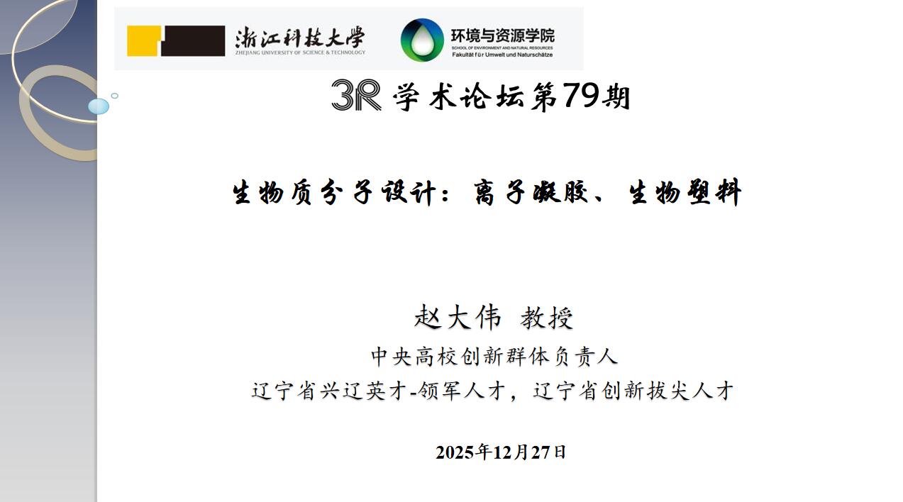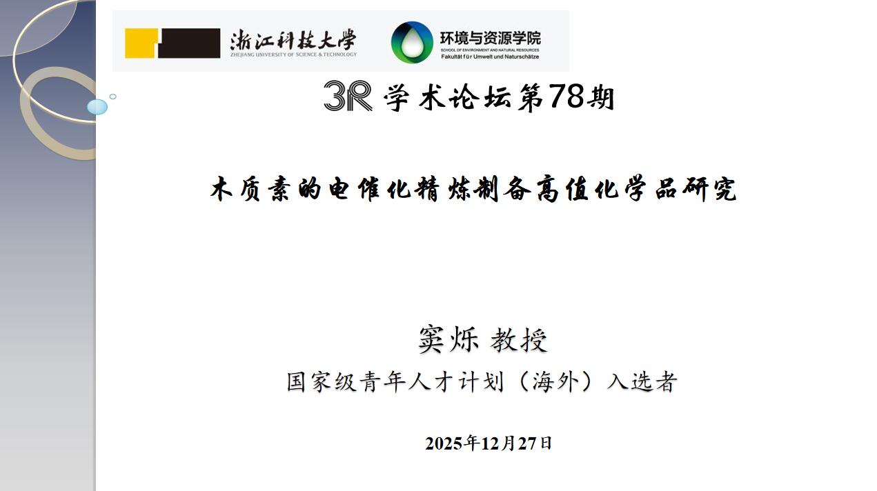 2025年12月27日下午,东北林业大学窦烁教授和沈阳化工大学赵大伟教授应邀访问我院,两位教授作为主讲嘉宾做了“3R”学术论坛第78/79期学术报告,题目分别为《木质素的电催化精炼制备高值化学品研究》和《生物质分子设计:离子凝胶、生物塑料》。报告会由翟尚儒教授主持,40余位师生参加本次报告会。