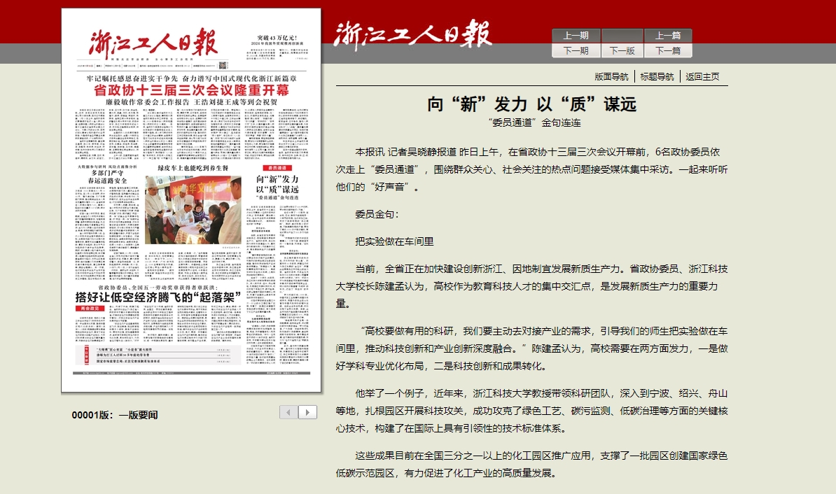 他举了一个例子,近年来,浙江科技大学教授带领科研团队,深入到宁波、绍兴、舟山等地,扎根园区开展科技攻关,成功攻克了绿色工艺、碳污监测、低碳治理等方面的关键核心技术,构建了在国际上具有引领性的技术标准体系。