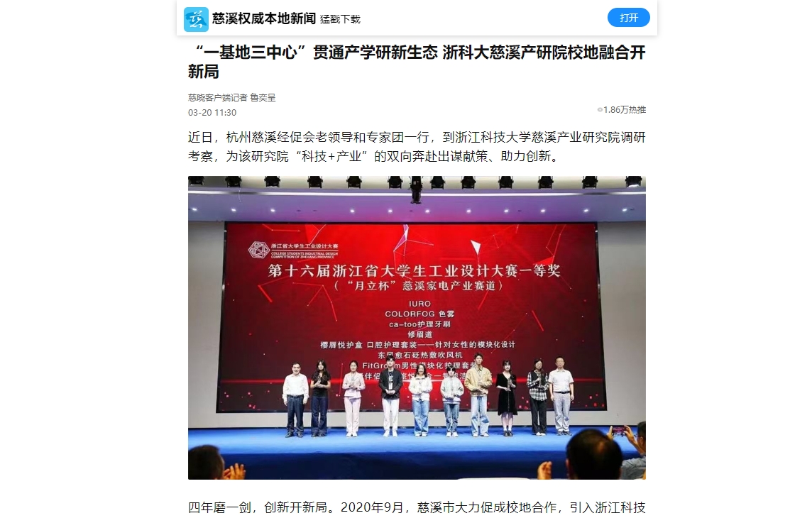 2020年9月,学校与慈溪市达成战略合作,携手共建产业研究院,研究院以浙江科技大学前湾研究生联合培养基地、浙江科技大学科技成果转移转化中心慈溪分中心、机器人与智能产业研究中心、创新设计研究中心为支撑,充分发挥人才优势,在人才引育、技术创新、成果转移转化等方面取得了显著成效,为建设共富共美现代化新慈溪作出了积极贡献。近日,慈晓APP、慈溪日报等媒体对慈溪产业研究院工作开展情况进行报道。
