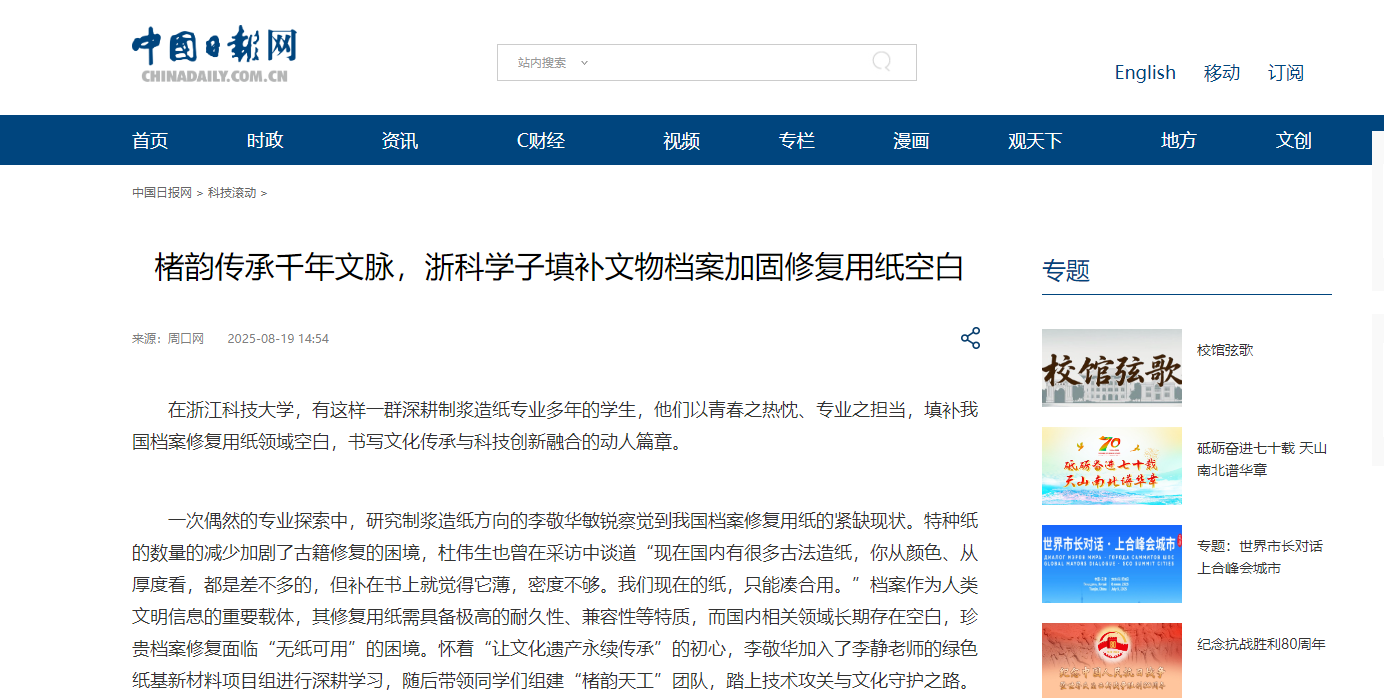 中国日报网:楮韵传承千年文脉,浙科学子填补文物档案加固修复用纸空白