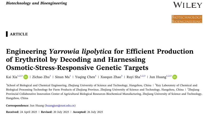 近日,生物催化与分子诊断团队以浙江科技大学为第一单位在生物化工领域经典期刊Biotechnology and Bioengineering上在线发表题为“Engineering Yarrowia lipolytica for efficient production of erythritol by decoding and harnessing osmotic-stress-responsive genetic targets”的论文。夏凯博士为该论文第一作者,黄俊教授为论文通讯作者。该研究得到浙江省高层次人才特殊支持计划项目(2022R52024)、浙江省教育厅一般科研项目(Y202351798)、浙江科技大学青年科学基金项目和团队创新项目(2025QN045、2025KC002)和浙江科技大学科研启动基金项目资助。