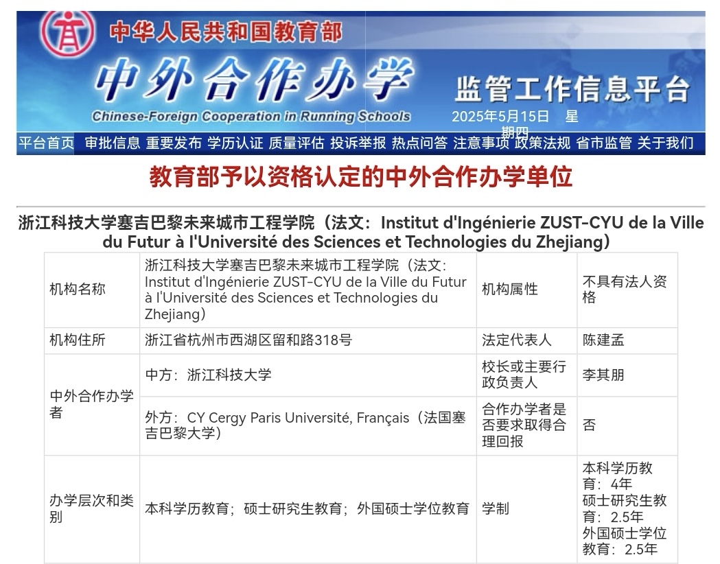 近日,教育部经评审批准了新一批中外合作办学机构和办学项目,教育部中外合作办学监管工作信息平台公布了相关信息。我校与法国塞吉巴黎大学合作设立的浙江科技大学塞吉巴黎未来城市工程学院正式获批,这是我校第二个获得教育部批准的非独立设置中外合作办学机构,是学校在国际化办学领域的重要成果。