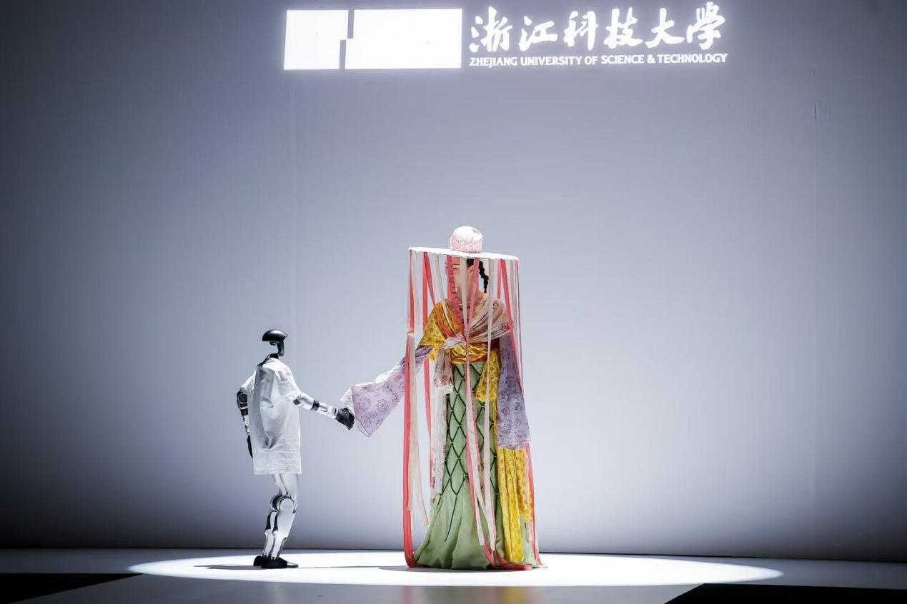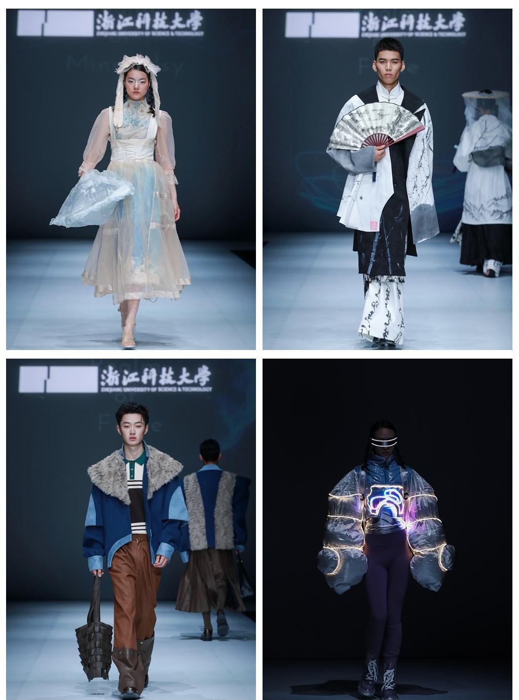 本次发布会以“熵变·新生”为主题,聚光灯下,搭载全息投影系统的仿生机器人“科科”迈着先锋的机械舞步,揭开了大秀序幕。35位本科及研究生新锐设计师带来81套作品,涵盖了时尚成衣、运动功能性服装、流行文化创意设计以及可持续时尚等多个领域。本次发布会的编排从先进科技与中国传统美学的对话出发,逐渐过渡到风格实验、材料创新、造型解构、非遗技艺,以极具实验性的设计语言诠释了从混沌到秩序的哲学思辨,展现了浙科大学子的蓬勃风采,为观众呈现了一场融合传统文化与现代创新的视觉盛宴。