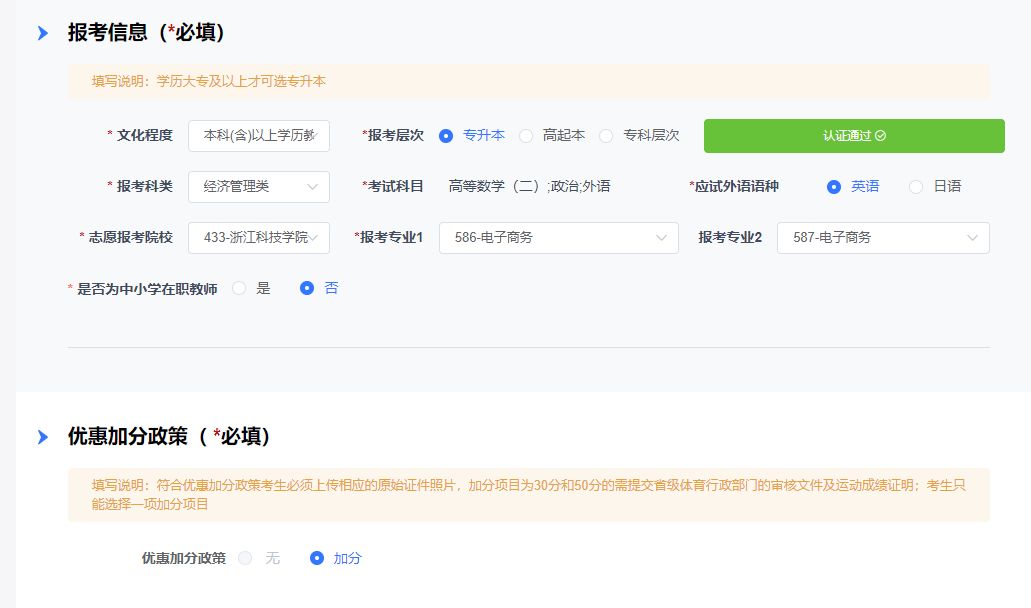 填写优惠加分政策:符合年龄大于25周岁、少数民族加分项目的系统已根据身份证自动添加。其他类型,则需提供相应的原始证件材料,具体参照各地市考试院通知。