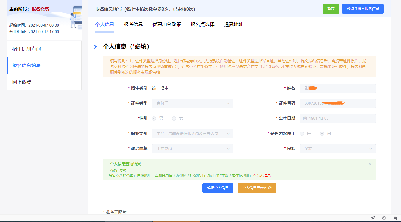 点击报名信息填写,按要求填写个人信息,并点击个人信息查询,会显示户籍、社保、居住证地址等信息。如无法查询,则需根据系统要求上传社保证明或者居住证。