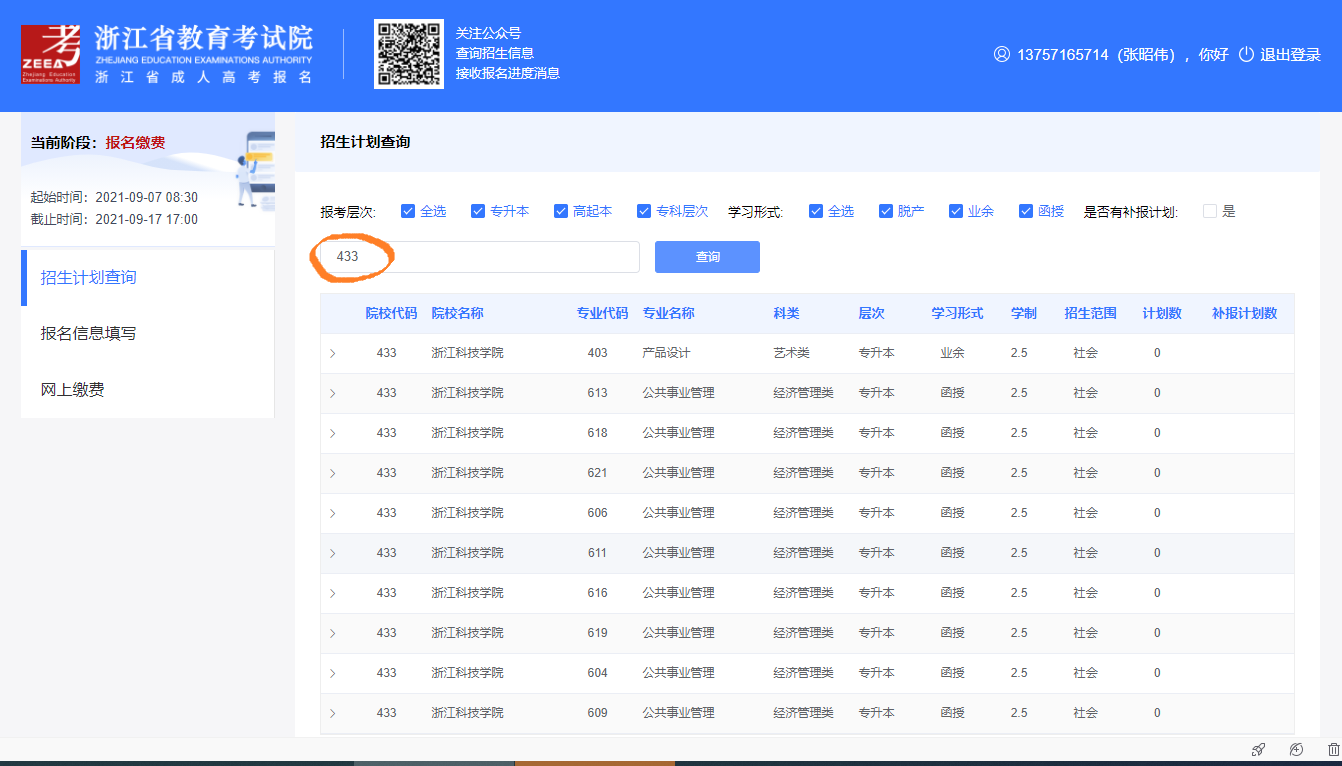 进入报名缴费阶段,可在招生计划查询板块输入433,按层次、学习形式查询“浙江科技学院”2021年招生专业信息。