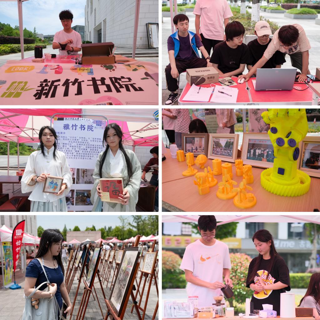 长期以来,安吉校区积极探索实践“书院制”学生管理与教育模式,书院文化“一院一品”渐具特色,六个书院打造六种文化品牌,开创了书院“百花齐放,成果共享,聚点成面,服务全局”的校园文化建设新格局,当天各书院带着独具匠心的“一院一品”特色文化活力登场:新竹书院的咖啡文创融入个人创造力,劲竹书院的AI创作歌曲极具科技感,雅竹书院的传统汉服展示尽显古韵美,翠竹书院的绿色低碳作品尽现环保意识,秀竹书院的经典文学挑战脑洞大开,怡竹书院的公益书画作品展拍满溢人文情,每一个角落都洋溢着书院学子活力向上的精气神,现场还有学生舞龙表演、诗朗诵《浙科大,奋进!》、合唱《我的祖国》等节目,共同燃爆热情的现场。(安吉校区 琚常鑫/文 学生蔡恒博、王锦渲、方彦/摄)