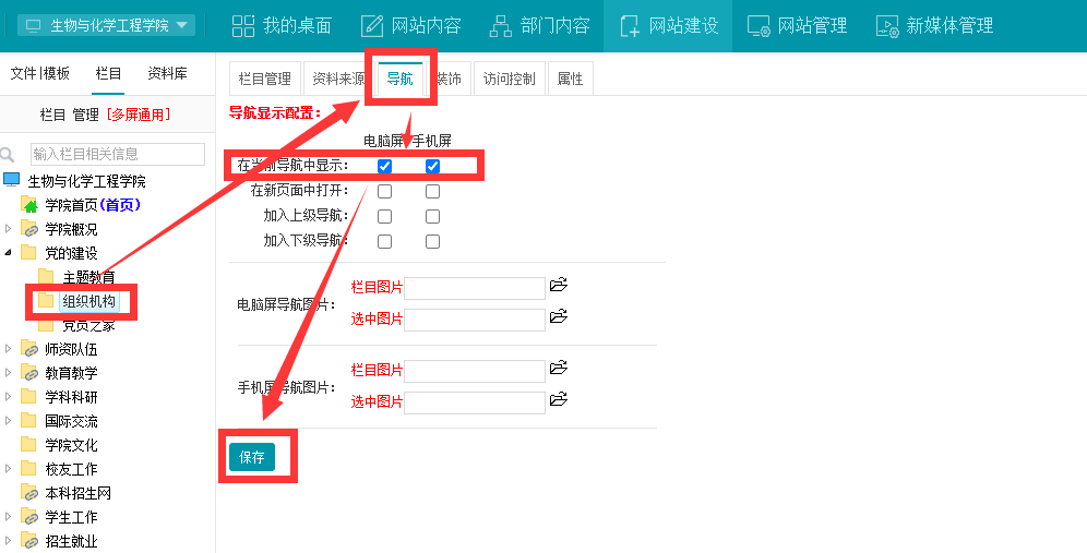 3.隐藏栏目:网站建设--栏目--该栏目的父栏目-需要隐藏的栏目,右侧导航,去掉显示勾选,保存,然后左下角发布网站即可。