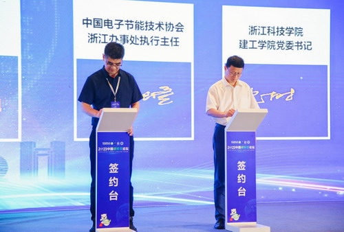 6月27日,浙江科技学院土木与建筑工程学院党委书记沈树声在中国碳标签国际论坛上出席签约仪式,浙江科技学院与中国电子节能协会低碳技术委员会签订碳中和产业人才联合培养基地,包含了碳标签评价、碳标签评价管理与认证等系列内容,以培养“双碳”新跑道上的优秀低碳领军人才、管理人才、专业人才和应用人才。