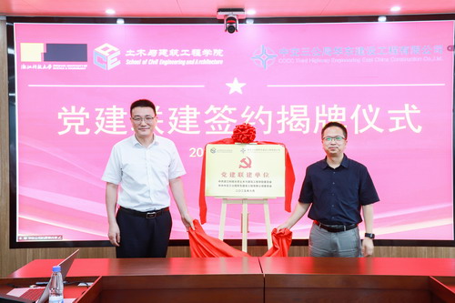 随后交流会举行了党建联建签约和揭牌仪式。在与会人员的共同见证下,双方正式签订了党建联建协议,并举行了揭牌仪式。这标志着浙江科技大学建工学院与中交三公局华东公司的党建联建工作正式启动,双方将在党建与业务融合的新模式、新路径探索上迈出坚实步伐。通过党建联建,双方将共同开展主题党日活动、党员教育培训、党建课题研究等活动,加强党组织之间的交流与合作,不断提升党建工作水平,以高质量党建引领校企合作高质量发展。