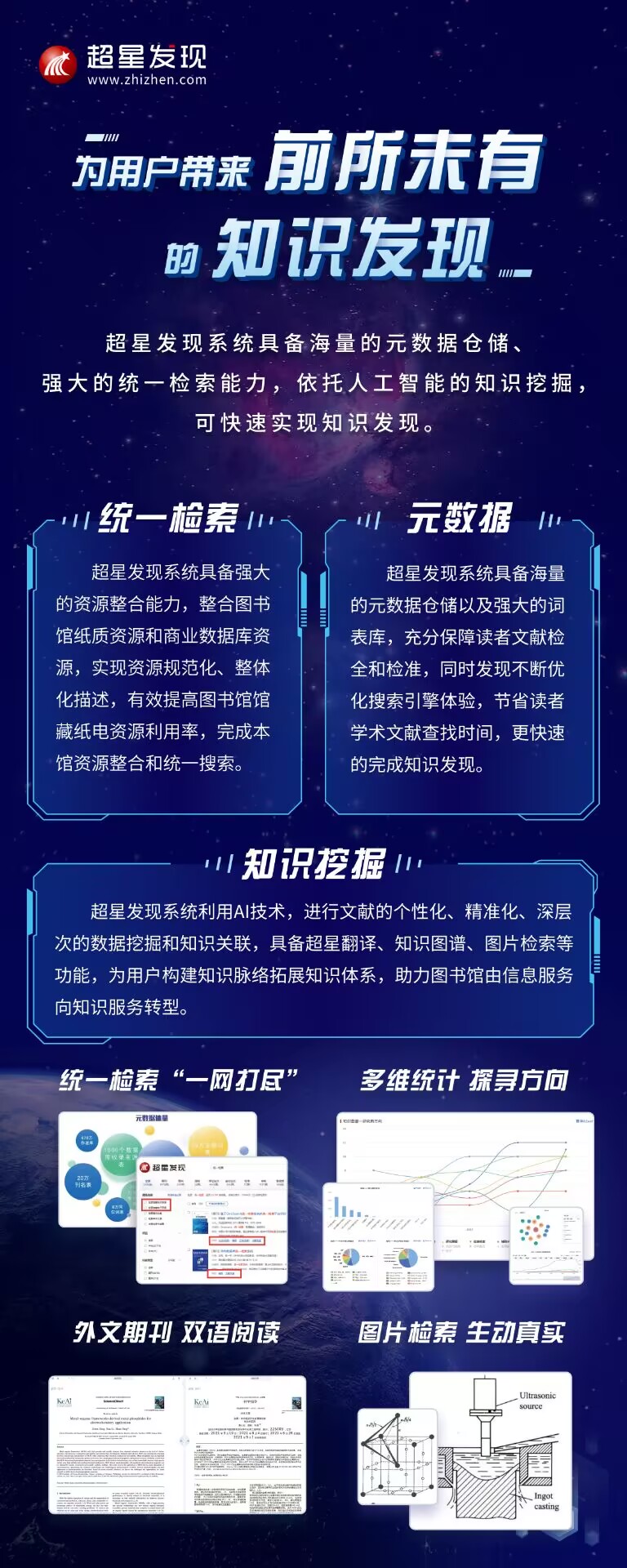 超星发现系统,整合本校本馆内外的图书、期刊、报纸、学位论文、标准、专利等各类文献,实现了图书馆电子资源的目录级管理,帮助用户更快更准确的在海量资源中找到所需,并通过多维分面筛选、智能辅助检索、可视化图谱等手段,为读者从整体上掌握学术发展趋势,发现高价值学术文献提供便捷、高效而权威的学习、研究工具。