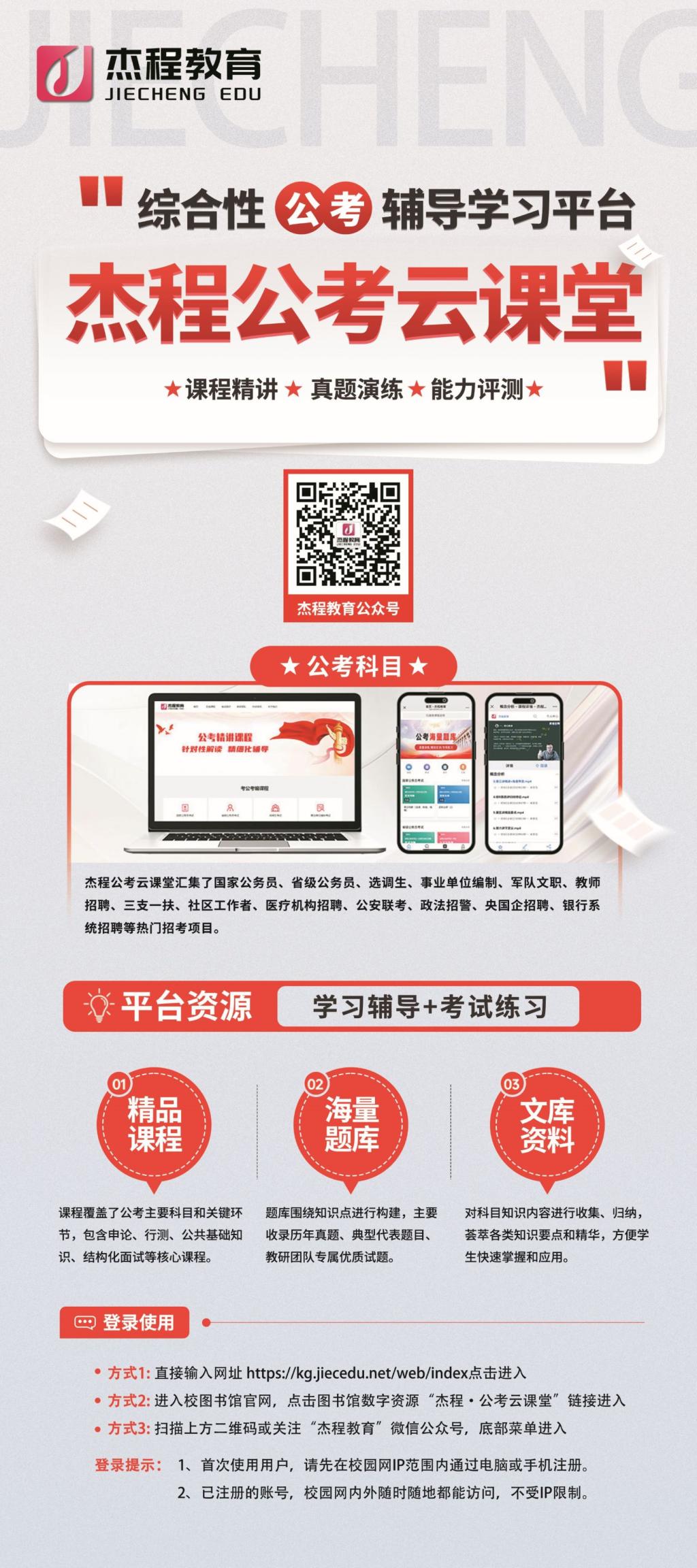 《杰程·公考云课堂》是一个综合性公考辅导学习平台,具有在线学习、备考指导、巩固练习、自主考试、模拟实训等功能。包含了公务员、事业单位、选调生、军队文职、三支一扶、教师招聘、医疗机构招聘、社区工作者、政法招警等热门招聘考试的核心课程、专业题库及真题试卷、招考资讯等学习资源。学员即可以进行系统性的知识学习,还可以进行专项薄弱环节的集中训练,也可以进行考前强化练习和模拟自测。为广大学员提供全方位的备考服务,帮助学员公考成功上岸。