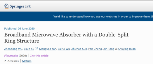 近日, 我院2017级应用物理学本科生吴震东同学在徐弼军老师指导下以第一作者身份在国际知名期刊《Plasmonics》(IF=2.926,中科院三区)发表了一篇高质量学术论文,报道了他们在超材料的吸收损耗特性最新研究成果。浙江科技学院为第一署名单位,徐弼军老师为论文通信作者。