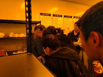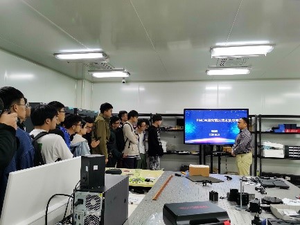 接下来,两个班的学生兵分两路分别参观了应用物理系下属的“光学深度感知实验室”、“激光雷达实验室”和“材料制备与测试实验室”。黄喆老师身着正装迎接同学,带领同学参观了微纳光学实验室,向同学们演示了衍射光学器件在灯光、人脸识别方面的应用,并简介了相关光刻工艺和核心制备设备-高速激光直写光刻机iGrapher-UV200,同学们首次零距离接触光刻机,表现的很兴奋(图3)。在激光雷达实验室,职亚楠老师提前准备了PPT,给同学们详细讲解了FMCW激光雷达的原理,特点,实验结果及未来应用,干货满满(图4)。随后,同学们在材料制备与测试实验室参观了一些样品合成与测试的设备和仪器,徐兴亮老师讲解了一些关于磁性材料和单晶的制备流程以及实验室安全注意事项(图5)。通过参观学习实验室,同学们表示对科研有了一个基本概念和了解,纷纷表示将来毕业后想继续深造从事一些感兴趣的科研工作。