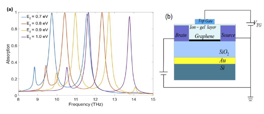 对于电磁吸波器而言,超材料的吸收损耗特性正好变成了优点。该论文提出了在太赫兹频段基于石墨烯的可调谐超材料完美吸收器。该吸收器以硅作为基底,依次将金、二氧化硅以及石墨烯层层放置,表面是双裂环结构由一个方型石墨烯裂环以及一个圆型石墨烯裂环结构组成。双裂环结构在频率10.96 THz和12.71 THz处存在两个吸收峰,吸收效率分别为99.7%和99.4%,接近完美吸收。此外,通过外加电压调节石墨烯介电常数,从而实现吸收峰的调节。研究结果表明基于石墨烯的可调谐超材料完美吸收器具有很好的应用前景。