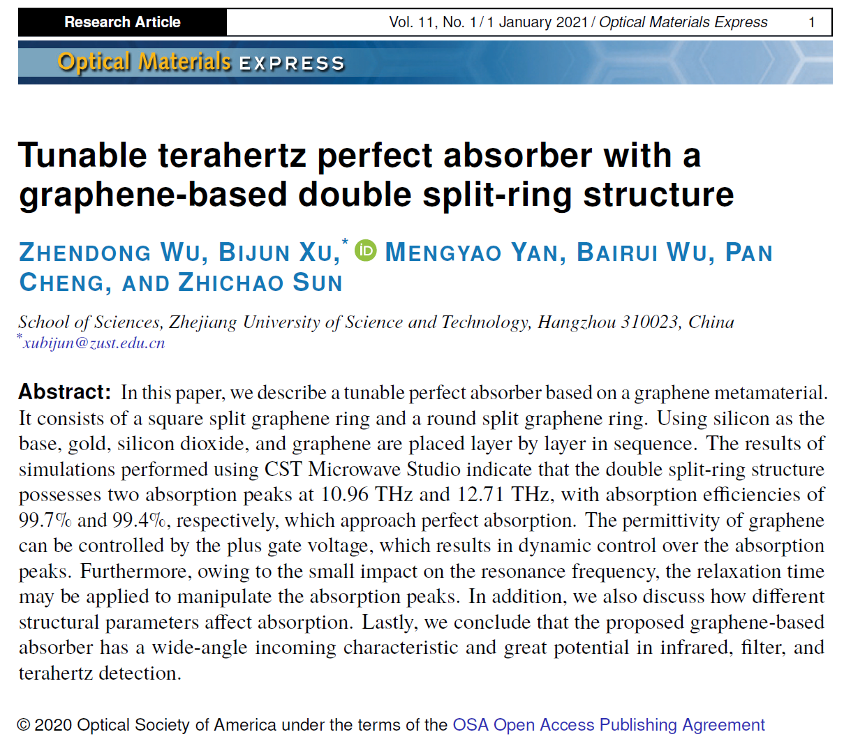 近日, 我院2017级应用物理学本科生吴震东同学在徐弼军老师指导下以第一作者身份在国际知名期刊《Optical Materials Express》(IF=3.064, JCR1区)再次发表了一篇高质量学术论文,报道了超材料在太赫兹频段吸收损耗特性的最新研究成果。浙江科技学院为论文的第一署名单位,徐弼军老师为论文通讯作者。此次发表的论文是继2020年6月他在期刊《Plasmonics》(IF=2.926,)首次一作发表论文后的第二篇一作研究论文。