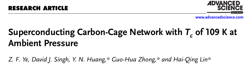 近日,浙江科技大学物理系黄衣娜副教授团队联合浙江大学、密苏里大学、和中国科学院深圳先进技术研究所在国际顶级期刊《Advanced Science》(中科院一区,Top,影响因子14.3)上发表了题为“Superconducting Carbon-Cage Network with Tc of 109 K at Ambient Pressure”的研究论文。浙江科技大学为第一单位,叶兆丰为论文第一作者,黄衣娜副教授,钟国华研究员,和林海青院士为通讯作者。此项研究获得国家自然科学基金和浙江省自然科学基金的资助。