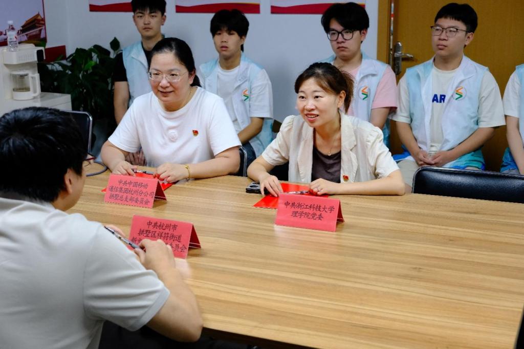 2025年7月15日,浙江科技大学理学院党委副书记沈艳婷与杭州市拱墅区祥符街道新文社区党支部书记沈权、中国移动通信集团拱墅分公司祥和分局支局长王见利,签署党建联建书,旨在加强家校社企多方合力,为理学院学子成长成才按下“加速键”。