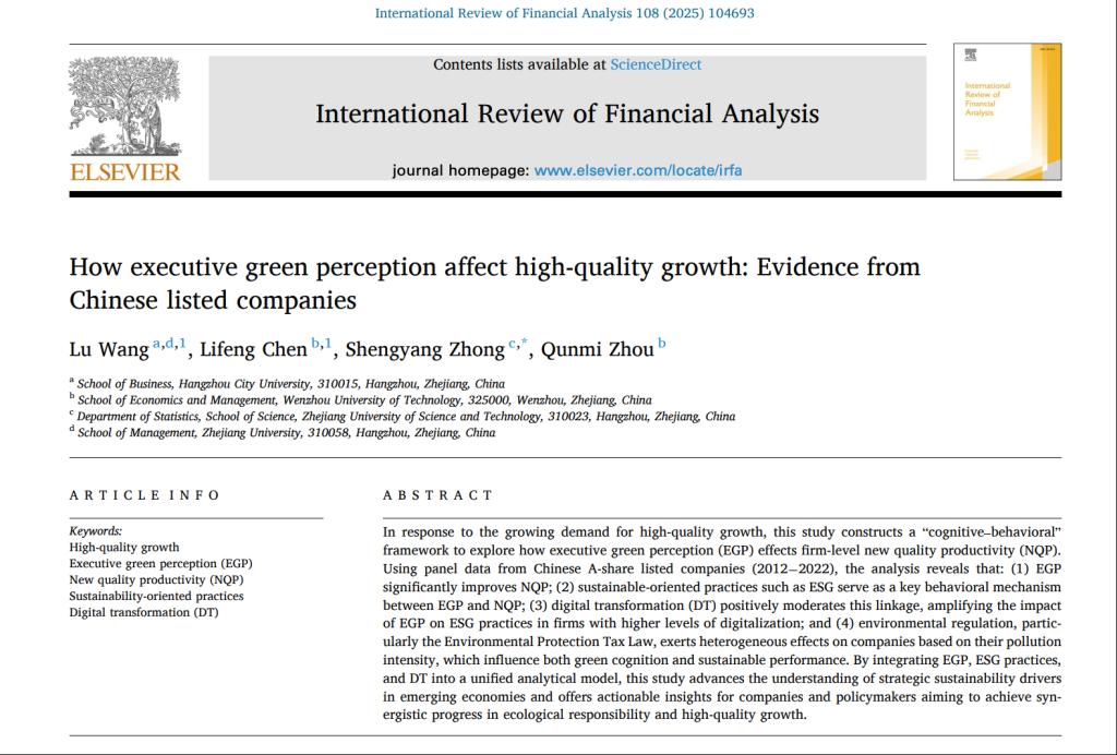 为响应高质量发展的时代需求,本研究构建了一个“认知—行为”分析框架,以探讨高管绿色认知(Executive Green Perception,EGP)如何影响企业高质量发展(NQP)。基于中国A股上市公司2012—2022年的面板数据,研究结果表明:(1)高管绿色认知能显著促进企业高质量发展;(2)以ESG为代表的可持续导向实践在EGP影响NQP的过程中发挥关键的行为机制作用;(3)数字化转型(Digital Transformation,DT)对这一关系具有正向调节效应,即在数字化水平较高的企业中,EGP对ESG实践的促进作用更为显著;(4)环境规制,尤其是《环境保护税法》,在不同污染强度企业间产生异质性影响,进而影响其绿色认知与可持续绩效。通过将EGP、ESG实践与DT纳入统一的分析框架,本研究深化了对新兴经济体战略性可持续发展驱动因素的理解,并为企业与政策制定者在实现生态责任与高质量发展协同进步方面提供了有益的实践启示。《International Review of Financial Analysis》是由爱思唯尔(Elsevier)出版的学术期刊,创刊于1991年,期刊聚焦全球金融热点问题,发表理论与实证研究,涵盖公司财务、数字经济与税收合规等领域,最新影响因子为9.8,位列JCR商业金融学科1区(排名2/241)及中科院TOP期刊,同时入选为澳大利亚ABDC评级A类、英国商学院协会ABS(AJG)三星期刊。(供稿:数学与统计系 )