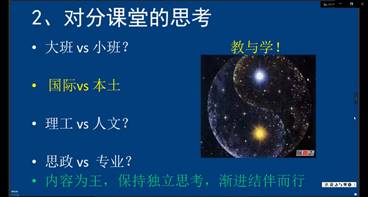 李世伟副教授接着以“对分课堂教学-思考与实践”为题,分析了对分课堂的理论依据,分享了内容为王、保持独立思考、教学对立统一的教学理念,还用视频展示了对分课堂在国际班中的实践。李老师总结了好老师可以有容错心、学习态、勤思考和多实践,放下“理想主义”、“完美主义”的双刃剑。最后,他还分享了自己的优秀教学案例。