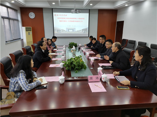 随后,陶祥兴院长介绍了我院的一些基本情况,介绍了我院在科学研究、学生培养、国际化合作、国家产业学院建设等方面取得一些成果,重点对中法大数据专业的国际合作以及硕士点申请等方面进行了经验介绍。陶院长希望双方在硕士点建设、科学研究、人才培养、国际化建设等方面加强深度合作,争取双赢。接着,湖州师范学院理学院应用物理系系主任庞涛博士对专业建设情况进行了专题汇报。最后,理学院院长沈彩万进行了总结发言,对我院来访人员表示热烈欢迎。经过此次考察活动,双方进行了深入的交流,并达成诸多共识。(应用物理系:徐兴亮)