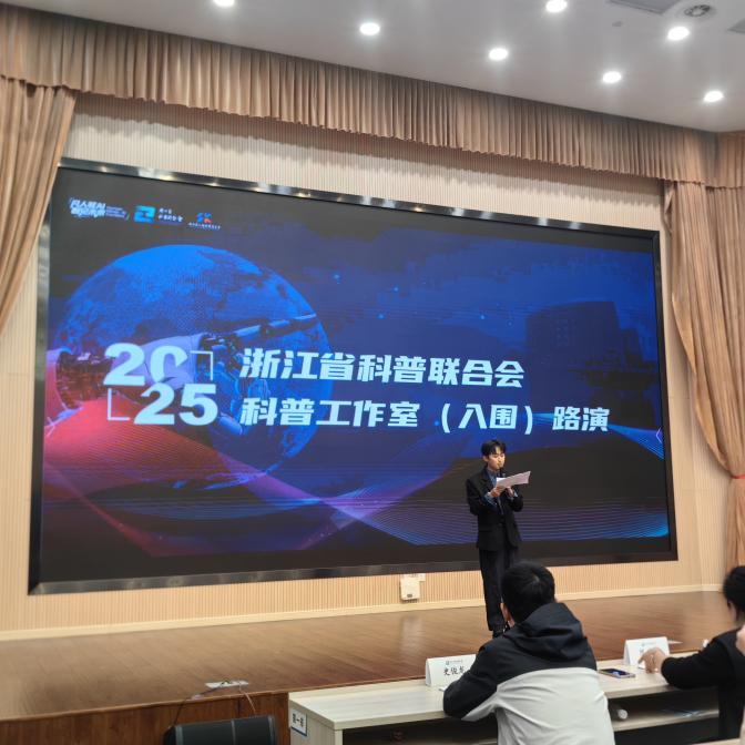 2025年10月29日,浙科大科技文化科普工作室蔡宇航受邀参加浙江省科普联合会在台州学院举办的浙江省第一批科普工作室(入围)路演汇报,通过现场路演汇报、专家评审,浙科大科技文化科普工作室被认定为第二批浙江省科普联合会科普工作室,由省科普联合会统一挂牌,从即日起可以以申报认定的完整工作室名开展科普工作。