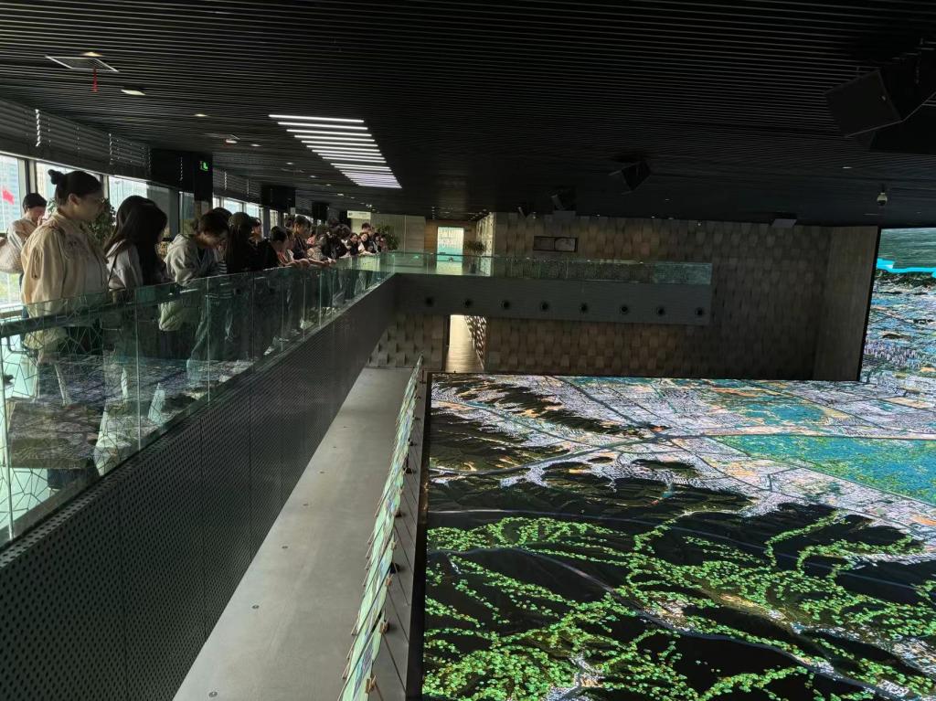 踏入了杭州城市规划展览馆,一楼“勇立潮头,逐梦一流”展区,用生动的讲解、精彩的视频,向我们展示了杭州在“八八战略”指引下作出的实践努力和取得的丰硕成果。“文化之城,品质杭州”展区追溯了山水杭州的文化、生命之源,连接历史文化古城的过去与未来,展现了杭州山水文化的美学气质。在讲解人员的介绍下,我们也了解到历代名人治理杭州时所展现的卓越智慧,现在杭城依稀可见当时遗迹如西湖“白堤”“苏堤”,钱塘江堤坝、京杭大运河等。