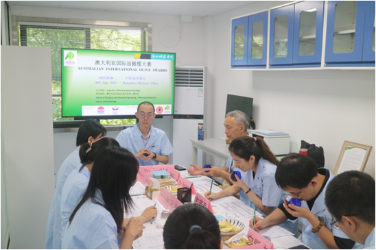 王伟研究员介绍了此次大赛的基本情况,澳大利亚橄榄油协会主席Michael Southan先生在线上对我院承办此次比赛表示感谢,代表大赛组委会给我校专门发来感谢信,希望进一步加深双方学术交流合作。2022年澳大利亚国际橄榄油大赛由澳大利亚油橄榄协会(AOA)主办,于9月6日在全球范围内包括西班牙、意大利、中国、新西兰和澳大利亚等5个赛点同日举行。中国赛点的评审由浙江科技学院生化学院承办,中国裁判组由我院王伟研究员、浙江省农科院朱申龙研究员、张玉副研究员、李雪博士以及甘肃陇南市经济林研究院副院长邓煜研究员等5位专家组成,王伟研究员担任中国赛点主裁判员。我院对橄榄油品鉴感兴趣的老师进行了现场观摩学习,为我校新裁判员培养奠定基础。