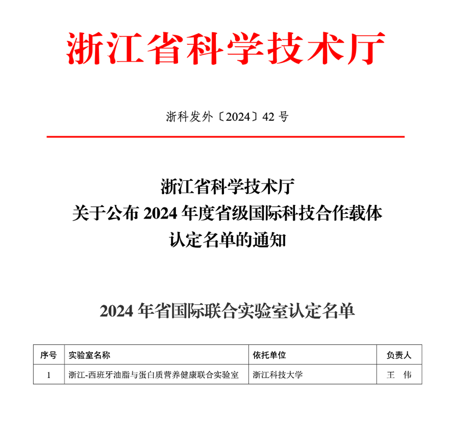 近日,浙江省科学技术厅下达了《关于公布2024年度省级国际科技合作载体认定名单的通知》,由浙江科技大学生物与化学工程学院王伟研究员牵头申报的“浙江-西班牙油脂与蛋白质营养健康联合实验室”被认定为2024年度省级国际科技合作载体。这一认定标志着浙江科技大学生化学院在国际合作与技术创新领域取得了新的突破。