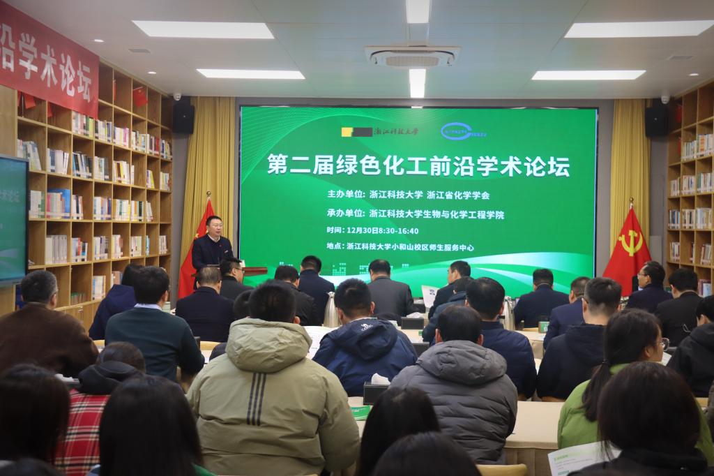 12 月 30 日,浙江科技大学迎来了一场化工领域的学术盛宴“第二届绿色化工前沿学术论坛”。该论坛由浙江科技大学携手浙江省化工学会共同主办,浙江科技大学生物与化学工程学院承办,在学校师生服务中心会议室顺利举行。浙江科技大学党委委员、副校长梁荣华教授出席本次论坛并致开幕辞,生化学院院长黄俊教授、学院党委书记路胜利教授、副院长吴元锋教授、副院长朱瑞瑜分别主持论坛,来自省内外化工领域的相关同行、浙江科技大学生物与化学工程学院的班子成员以及师生等 80 余人齐聚一堂,共襄盛举。