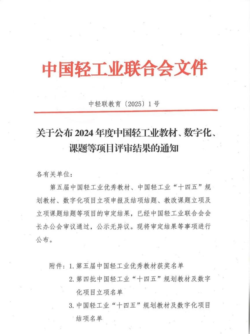 据悉,中国轻工业优秀教材评选由中国轻工业联合会教育工作分会自2014年起组织实施,2年评审一次。2024年申报300多部教材,专家评审出一等奖12项、二等奖16项、三等奖18项、优秀奖14项。