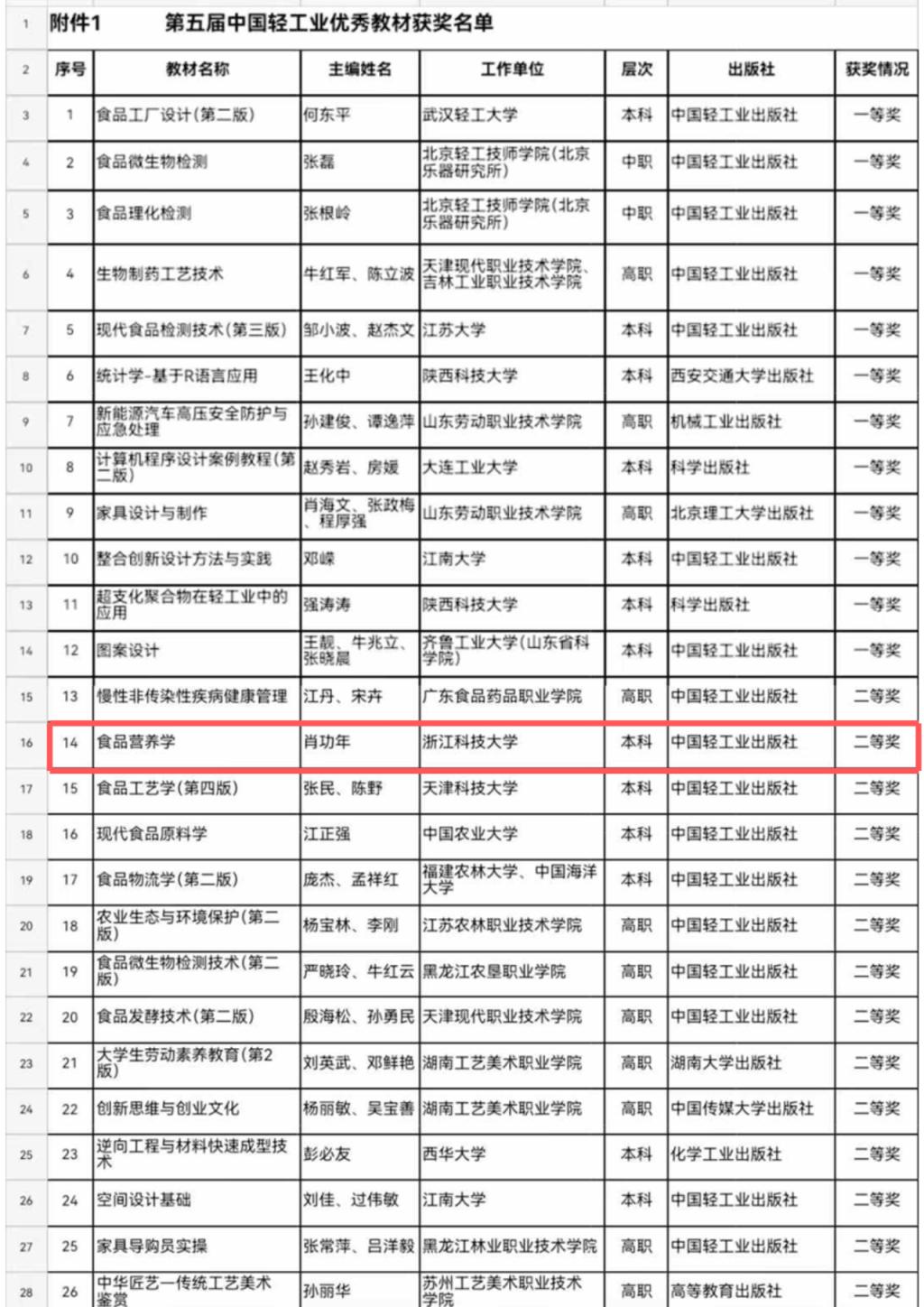 近日,中国轻工业联合会发布了《关于公布中国轻工业优秀教材等项目审定结果的通知》(中轻联教育〔2025〕1号),肖功年教授主编的教材《食品营养学》(本科)喜获二等奖,是浙江高校中唯一的1项二等奖。
