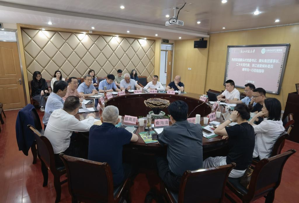 5月12日,滕头村党委书记、滕头集团董事长、党的二十大代表、浙江省委候补委员傅平均,滕头集团顾问盛高亮,原奉化教育局局长俞海清,奉化区投促中心副主任田武林,奉化区驻杭州市招商站站长周涛,滕头村党委委员、滕头控股副总裁、滕头农业总经理余海龙,滕头集团办公室主任葛家骏,滕头集团投资总监周建伟,滕头控股总裁助理李钧,浙江元春堂生命科技有限公司董事长刘金华等一行来访我校,开展校地企合作对接。校科技处副处长沙如意,生化学院院长刘赫扬、党委书记路胜利等一行参与接待。我校浙江省农业生物资源生化制造协同创新中心主任毛建卫主持会议。