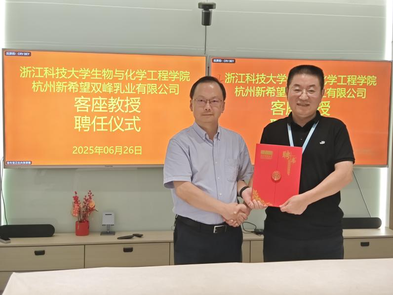 吴元锋代表学院为赵广生颁发了浙江科技大学生物与化学工程学院客座教授聘书,期待其以企业实践经验赋能学生培养,通过专题讲座、实践指导等形式拓宽学生行业视野。