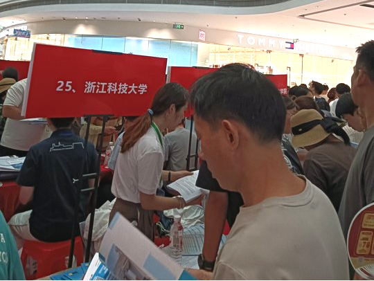 6月28日,朱春凤、余欣两位老师在金华永康万达广场招生宣传咨询现场,为前来咨询的考生、家长解答志愿填报疑问,介绍学校报考情况。
