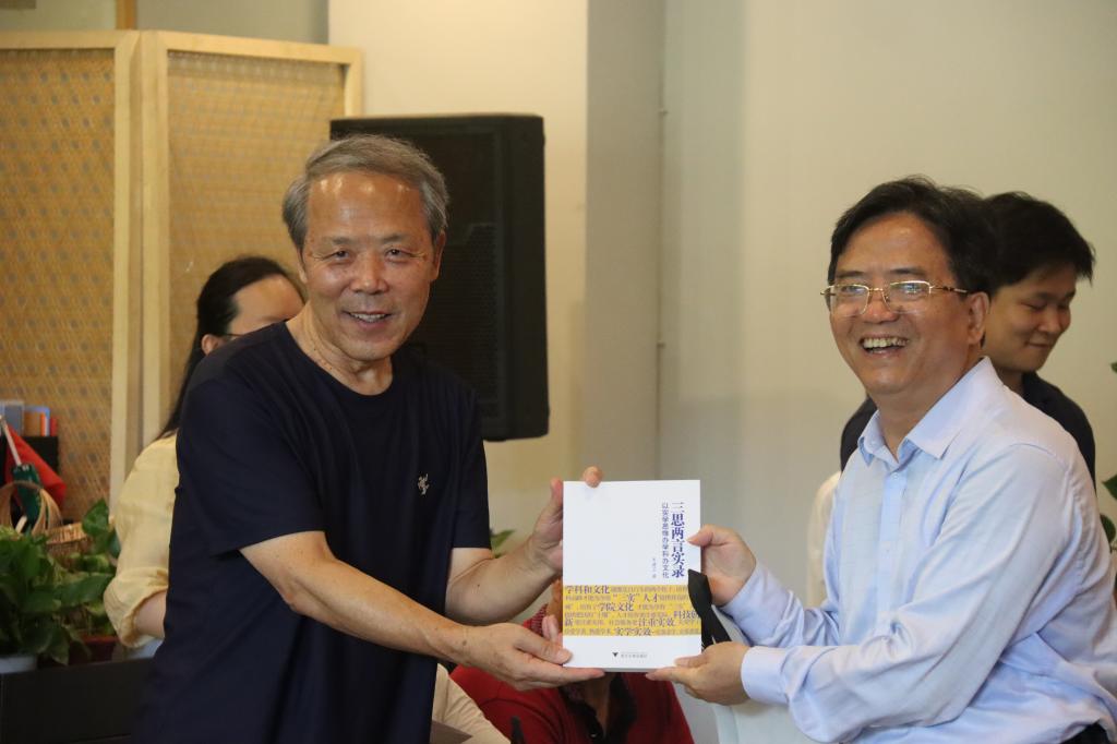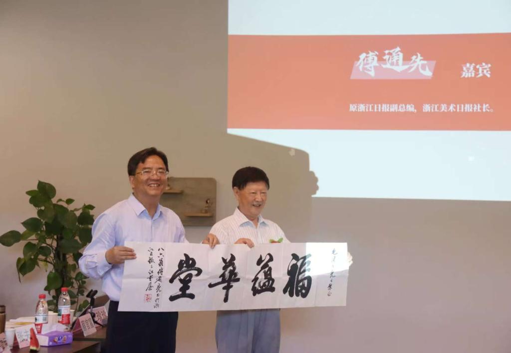 在作品互赠环节,傅通先,张夫有,省农科院原副院长、省特级专家徐子伟,黄宾虹书画院院长赵如真,杭州诗社副社长王奇,中国美术家协会中华国礼书画家周恒龙,中国书法学院教授王建勇等,现场向浙江科技大学赠送个人著作与书法作品,展示中国书画文化、文学成果。毛建卫教授亦回赠个人著作《三思两言实录——以实学思维办学科办文化》。