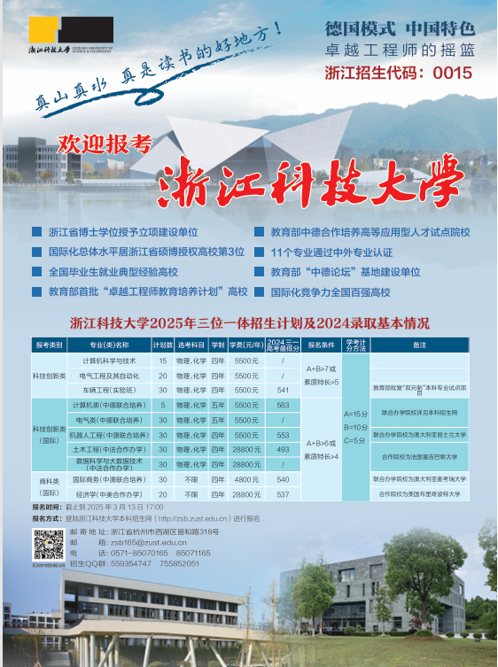 1、2025年浙江科技大学三位一体报名时间:第一阶段,2025年3月2日9:00-3月13日17:00(所有考生报名,含申请素质特长的考生),第二阶段,3月15日9:00-3月20日17:00(申请素质特长的考生再报名系统提交证明材料)。报名时候是按报考类别报名,只能选择其中一个报考类别进行报名,默认兼报该报考类别下所有专业。