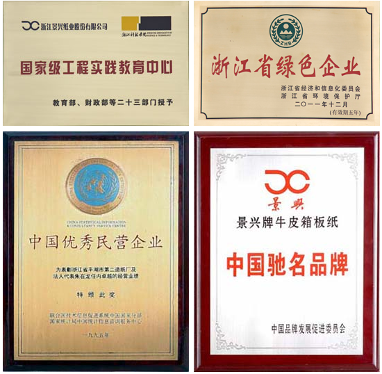 景兴以技术为依托,以品质求生存,以服务争市场,以效益谋发展,先后获得了浙江省“高新技术企业”、国家首批“资源节约型、环境友好型”试点企业、中国500强规模民营企业、中国包装龙头企业、全国造纸行业劳动关系和谐企业、浙江省诚信示范单位、浙江省四星级环保诚信企业、浙江省绿色企业、浙江省文明单位、浙江省知名商号等荣誉称号,还连年被上级政府和部门评为先进企业和“重合同,守信用”单位,并在同行中率先通过了ISO9001质量管理体系认证和ISO14001环境管理体系认证。公司产品先后获得国家级新产品、中国包装名牌产品、浙江省名牌产品等称号,“景兴”牌商标被认定为中国驰名品牌、浙江省著名商标等。
